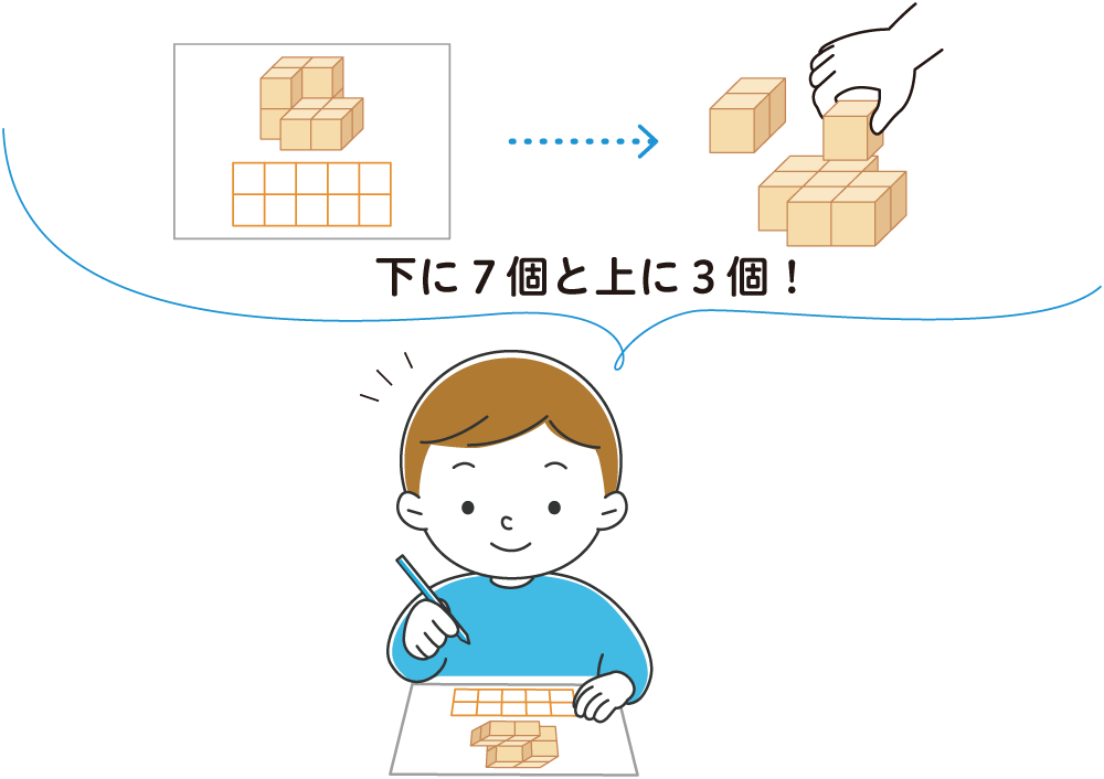 具体物を手で操作すると、「立体」のイメージや「数」のイメージがつきます。次にプリント問題に進んだとき、具体物操作で得た体験は確かな手がかりとなり、理解を助けます。
