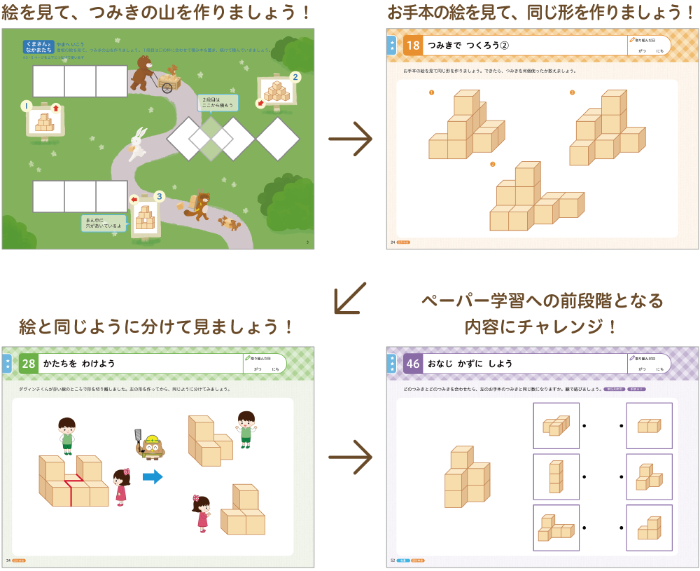 「はじめて編」は、つみきを枠に合わせてぴったり置くことから始め、つみきのお手本と同じように形を作る⇒つみきの絵と同じように形を作る⇒形を操作する⇒見え方の基本を確認する…というように、段階的に理解を深めていきます。