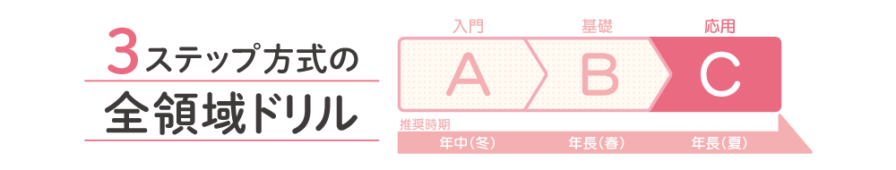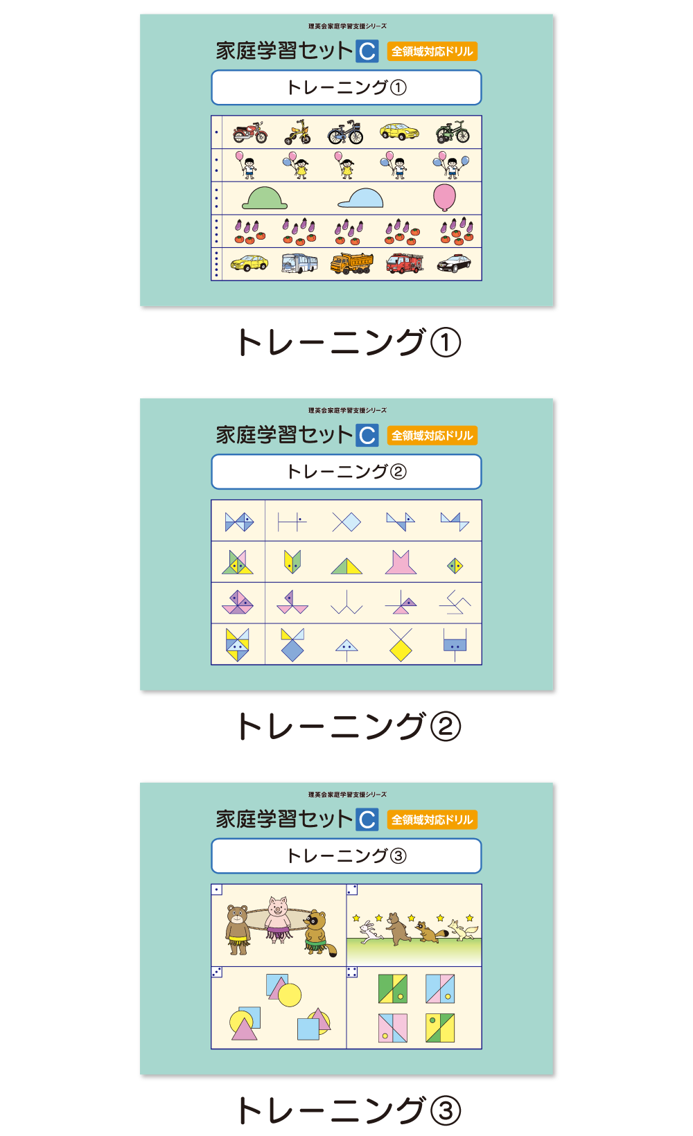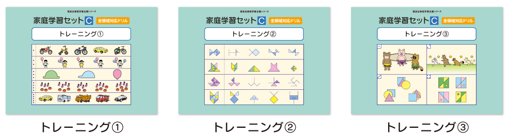 「家庭学習セット」は、小学校受験で特に頻出する単元を中心に、総合的な学習ができるように編集された家庭用教材です。3ステップに分けて編集していますので、A(入門)⇒B(基礎)⇒C(応用)と進めていくことで、入試本番に向けて、この時期にぴったりのトレーニングができます。