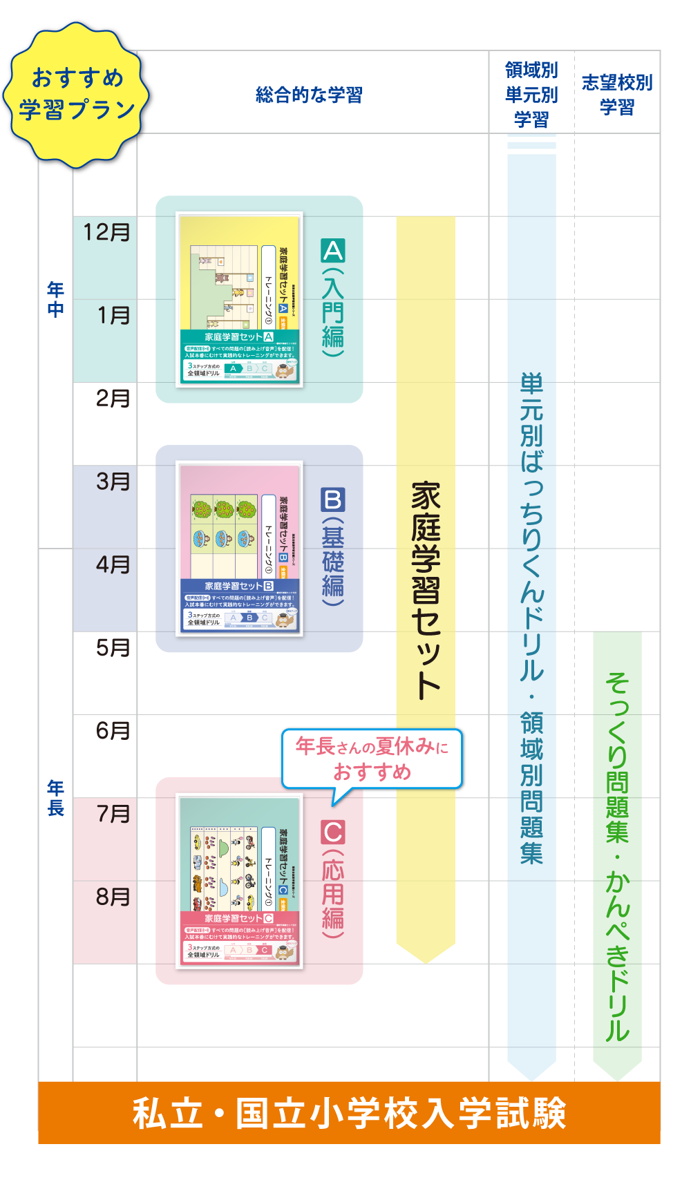 「家庭学習セット」は、A(入門)⇒B(基礎)⇒C(応用)の3ステップで取り組める家庭学習用教材です。年中の冬休みにAから順に進めていただくことで、無理なくステップアップできます。入試に向けた1年間のおすすめ学習プランをご紹介していますので、ぜひ参考にしてみてください。