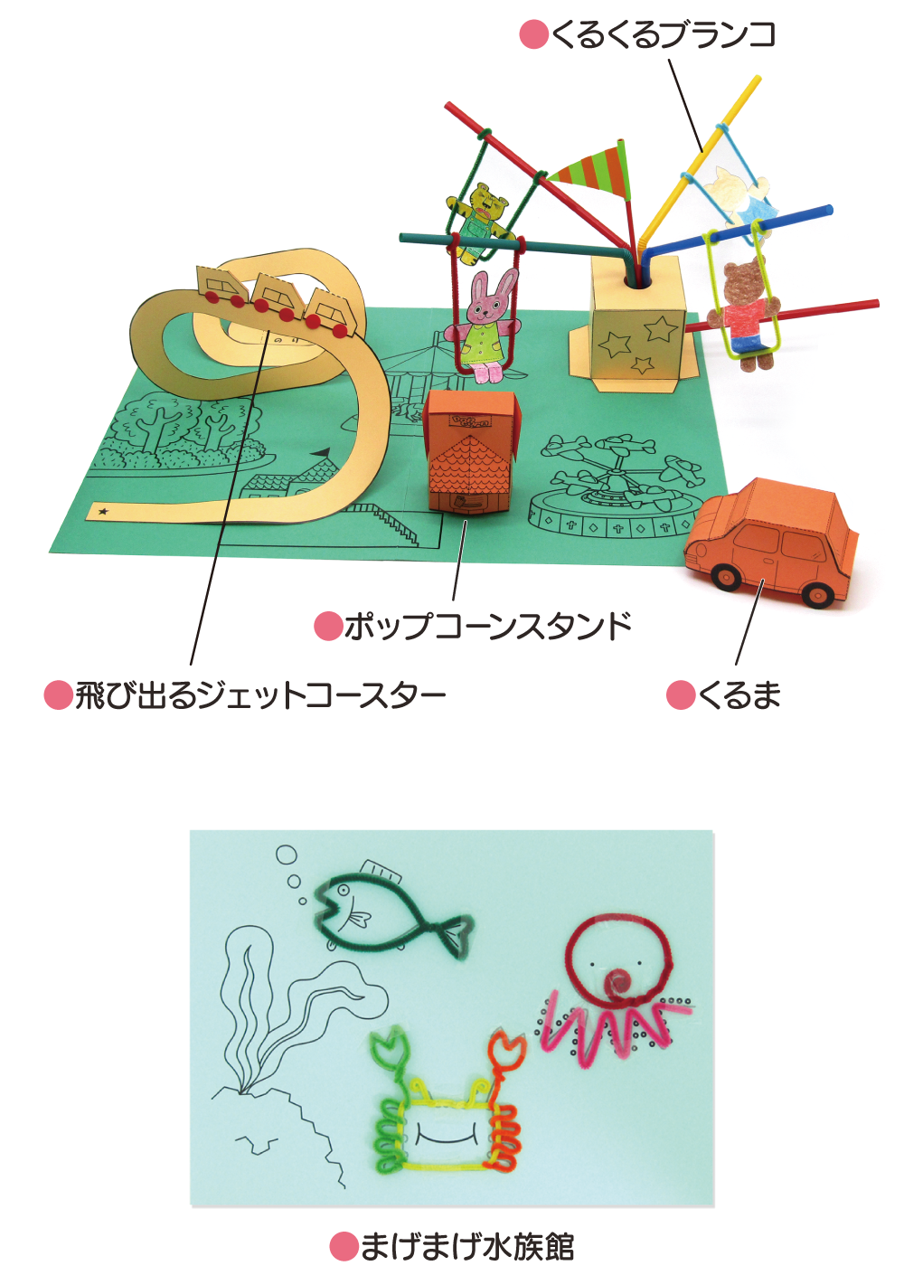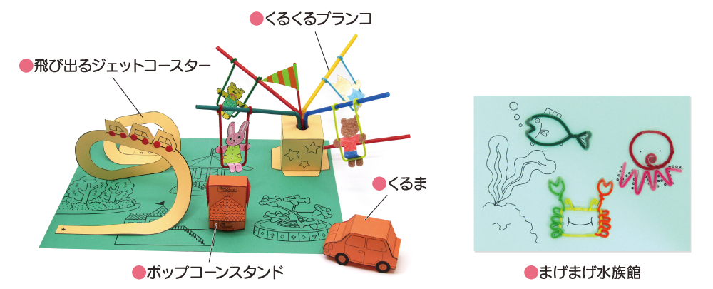 『飛び出るジェットコースター』『ポップコーンスタンド』『くるま』『くるくるブランコ』『まげまげ水族館』