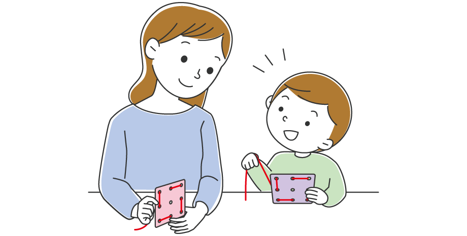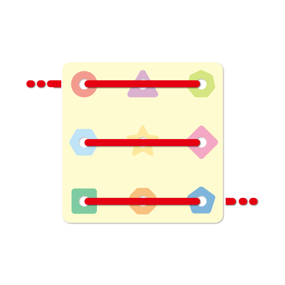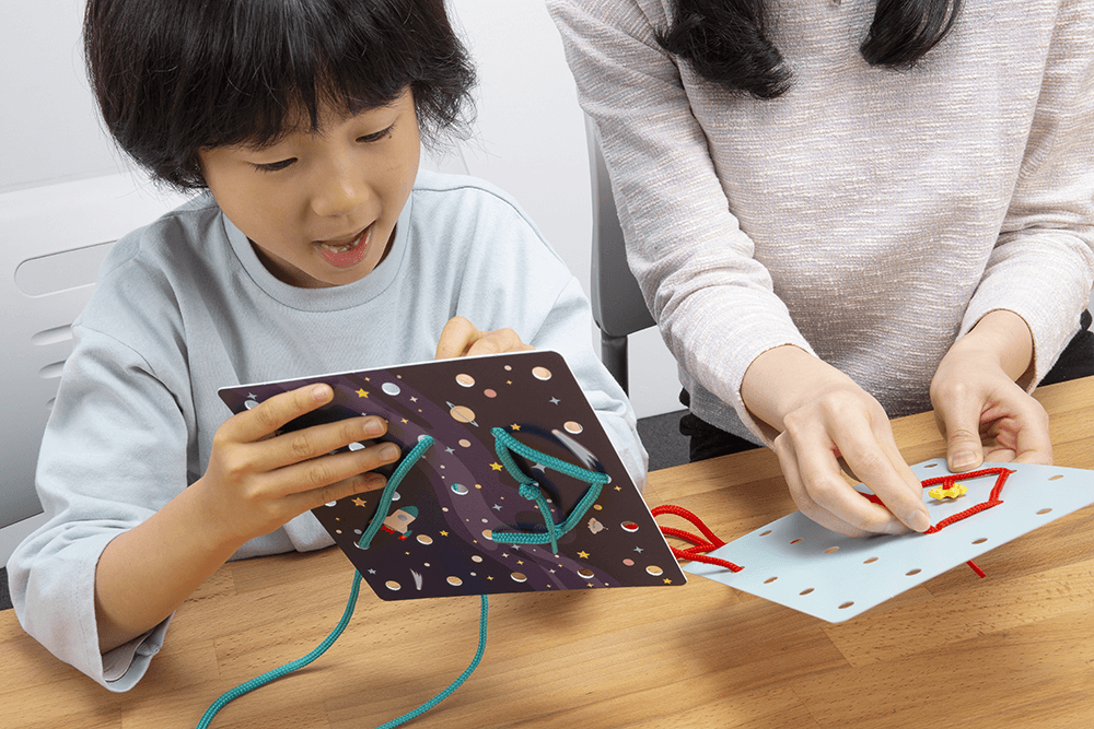 お家の方が実物を使って説明し、お子さまが課題に取り組むことができます。「紐をどの穴に、上から通すのか下から通すのか」といった細かな指先の動きが視覚的に伝わりやすく、お子さまの理解がスムーズに深まります。