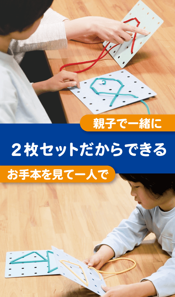 ひもとおし板は各2枚あるので親子で取り組めます。