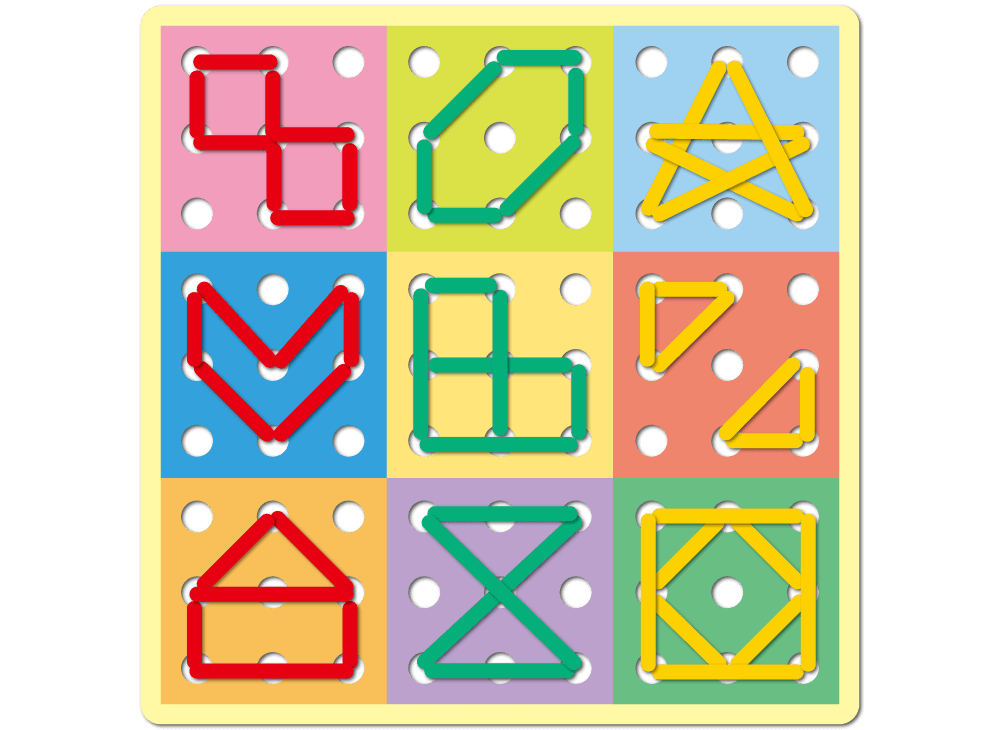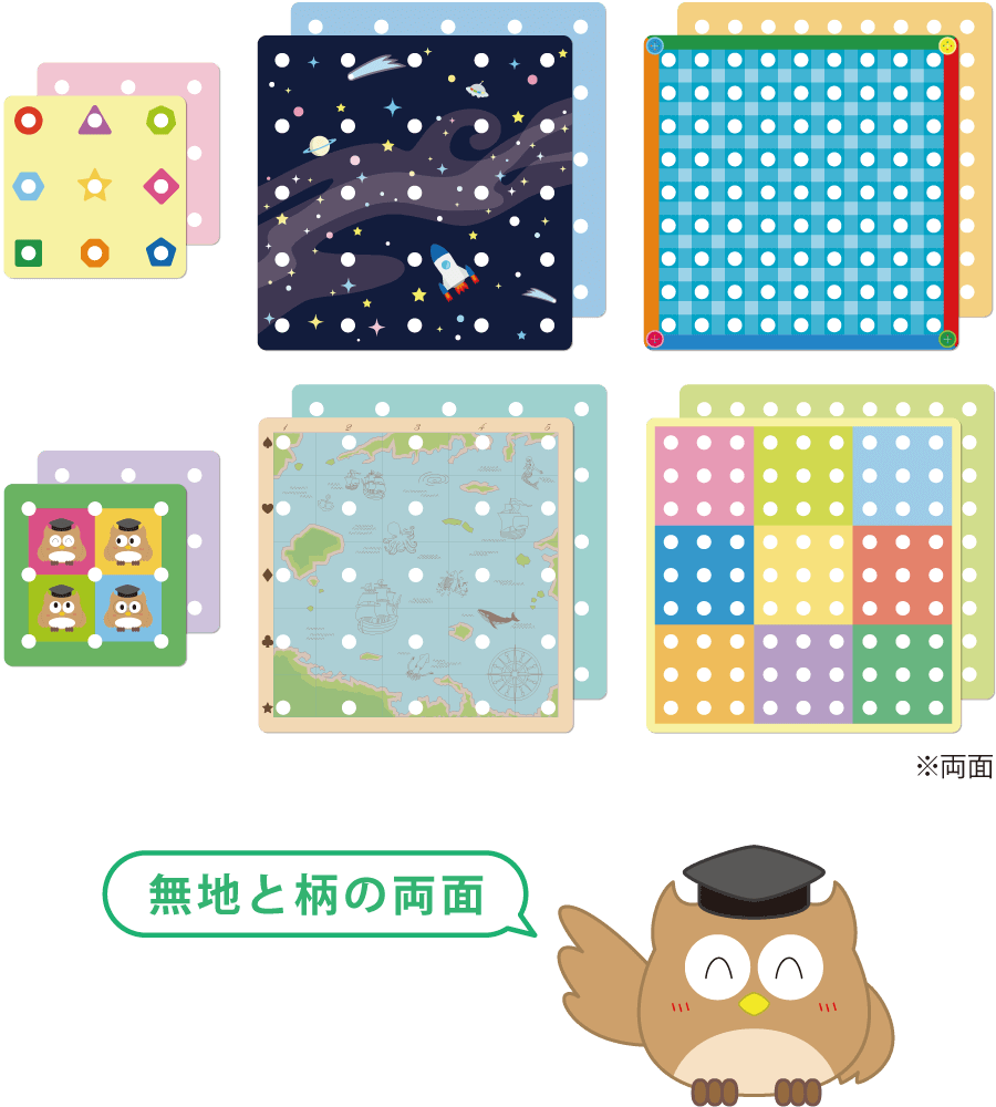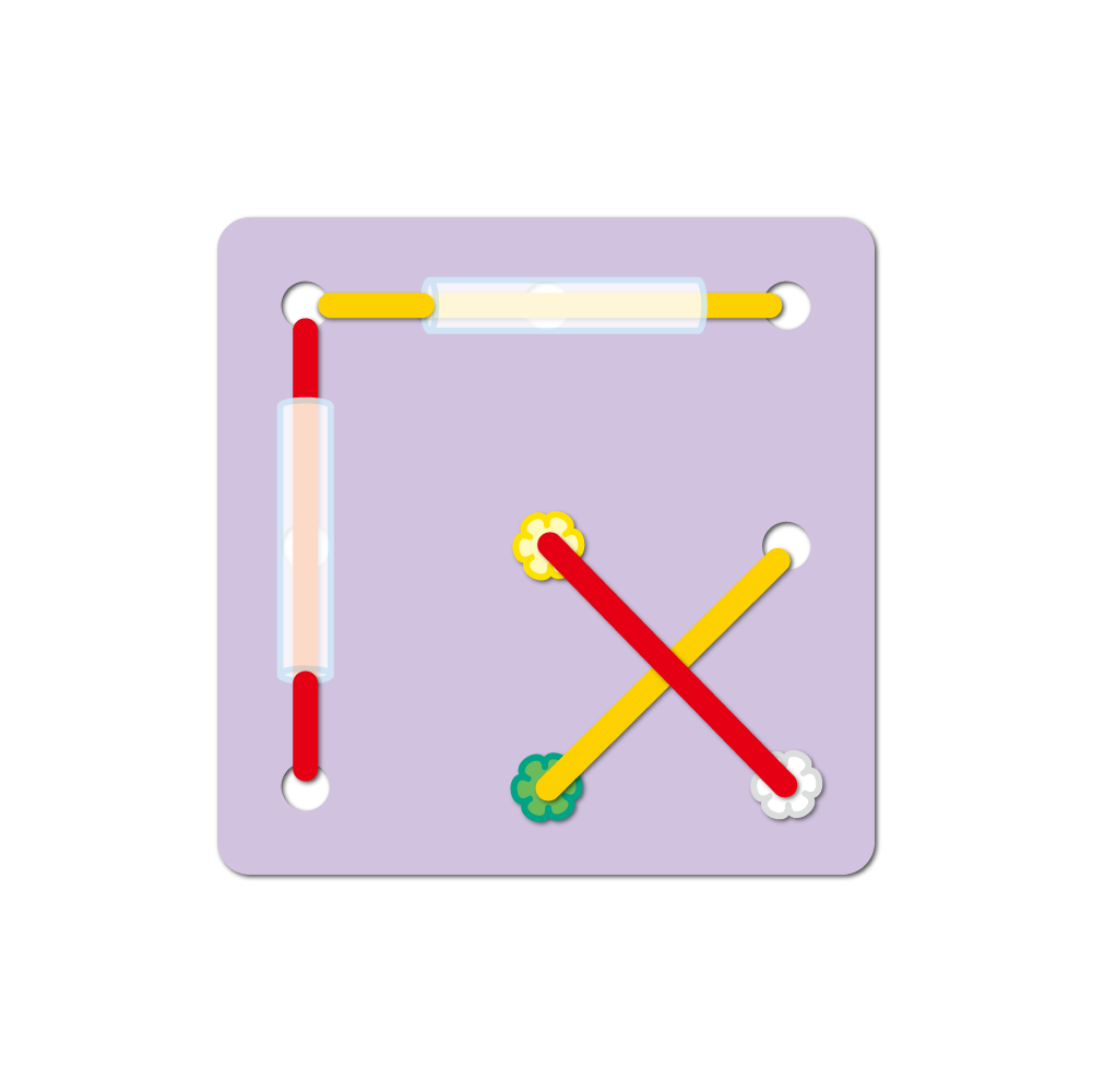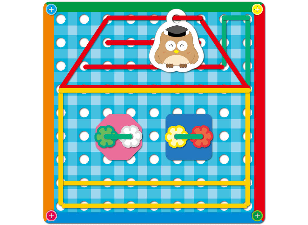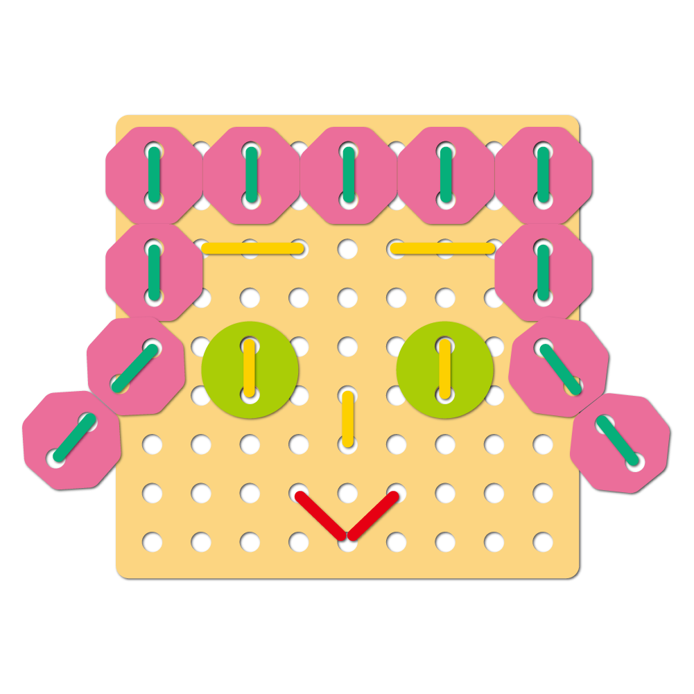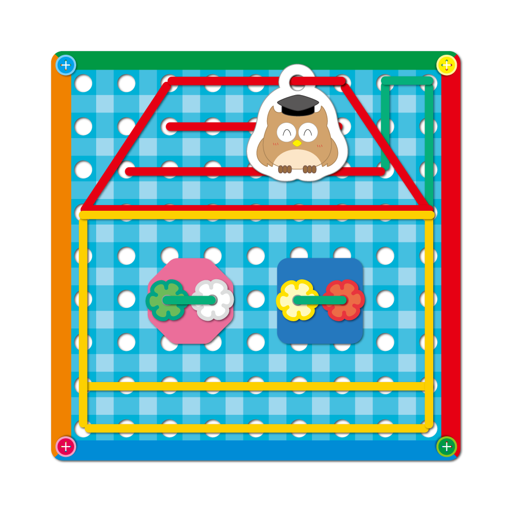 手先の巧緻性や創造力、仮説思考力や位置の認識力を育てることを目的とした教材です。3×3・5×5・9×9のひもとおし板が各2枚用意されているので、お家の方とお子さまが一緒に取り組むことができます。また、ひもとおし板の片面は入試対策に使用できる無地、もう片面は楽しい絵や模様がついています。紐やカラフルなパーツ類を組み合わせて、自分だけの楽しい作品を作りましょう。