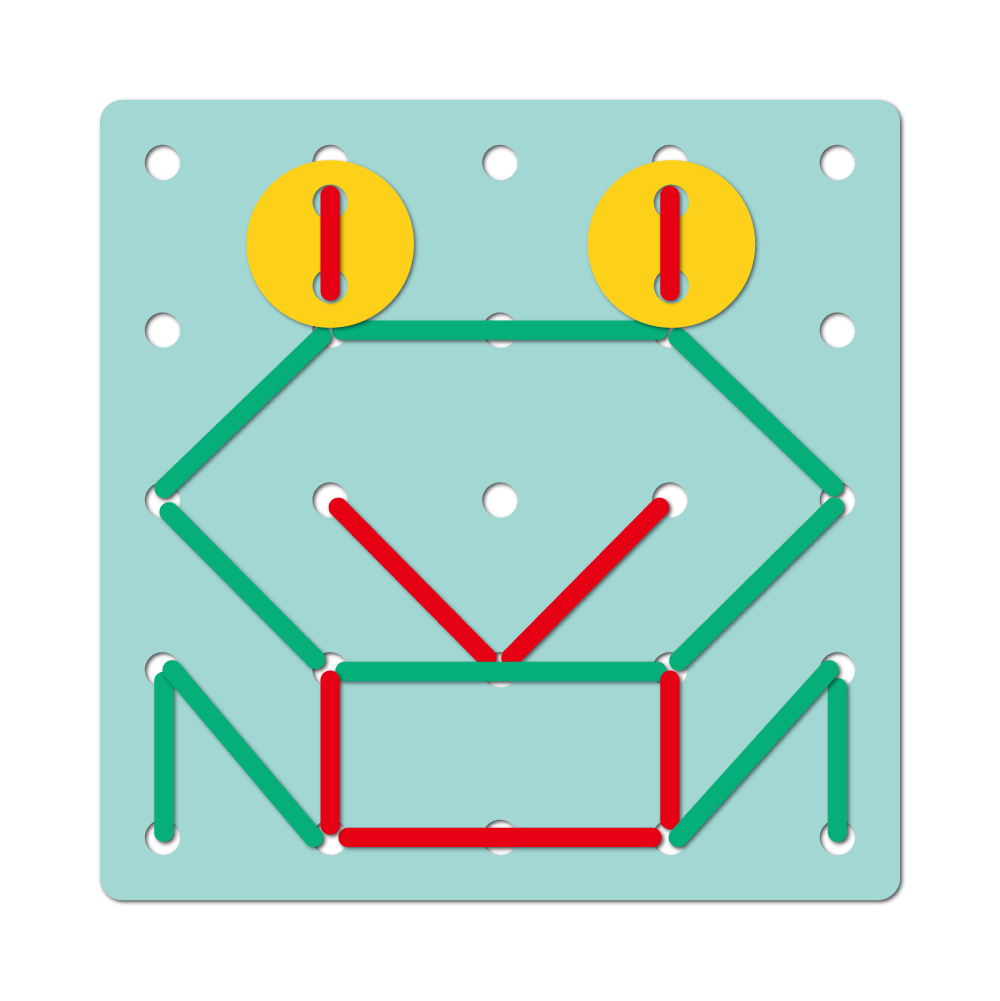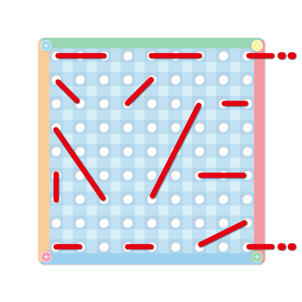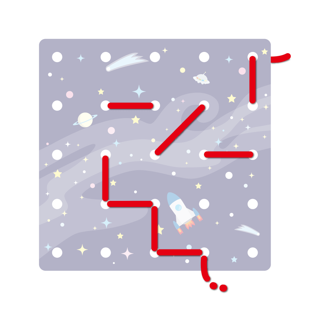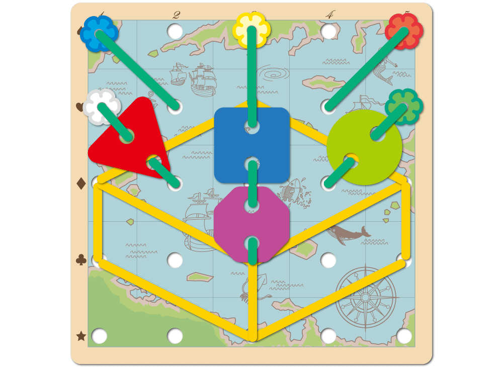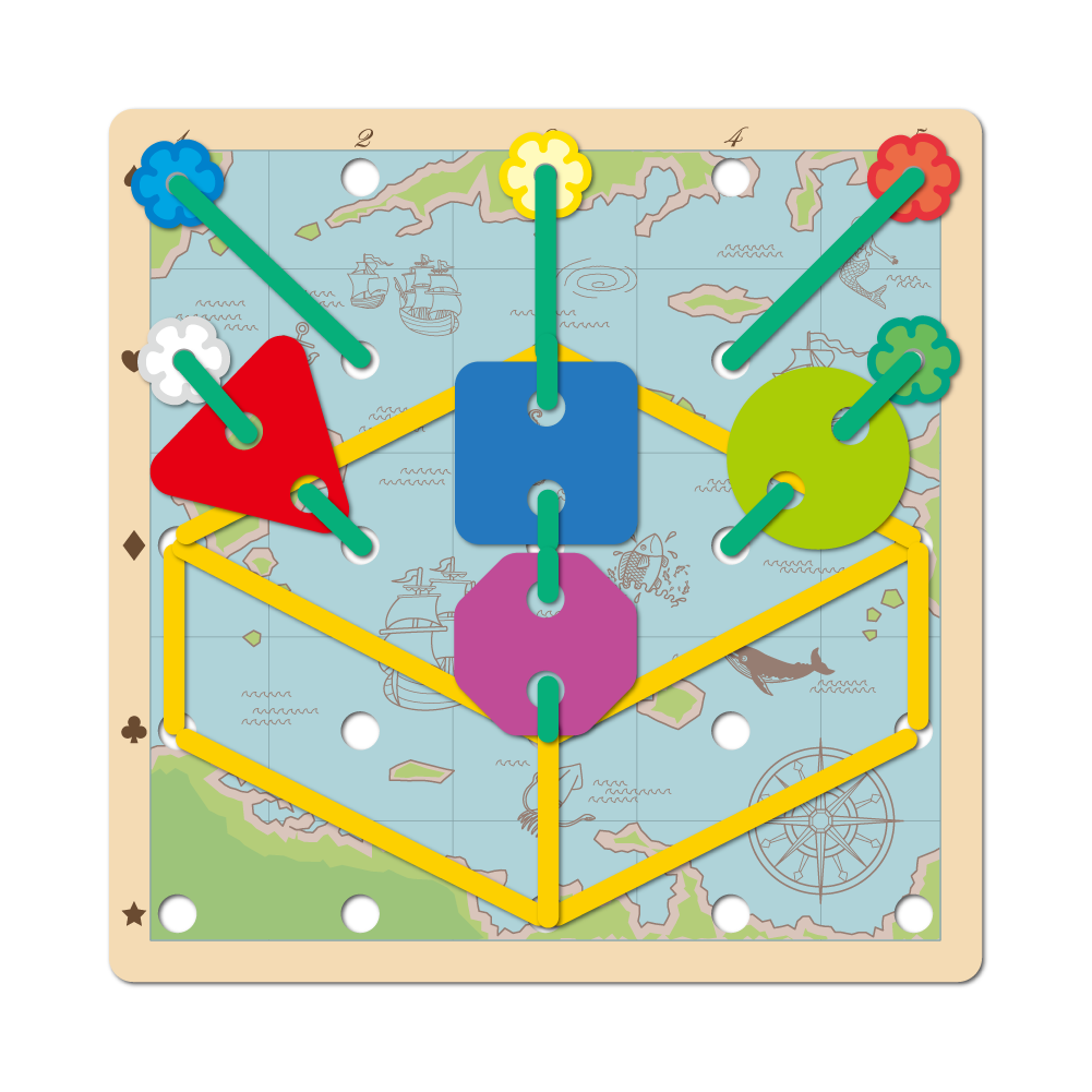 手先の巧緻性や創造力、仮説思考力や位置の認識力を育てることを目的とした教材です。3×3・5×5・9×9のひもとおし板が各2枚用意されているので、お家の方とお子さまが一緒に取り組むことができます。また、ひもとおし板の片面は入試対策に使用できる無地、もう片面は楽しい絵や模様がついています。紐やカラフルなパーツ類を組み合わせて、自分だけの楽しい作品を作りましょう。