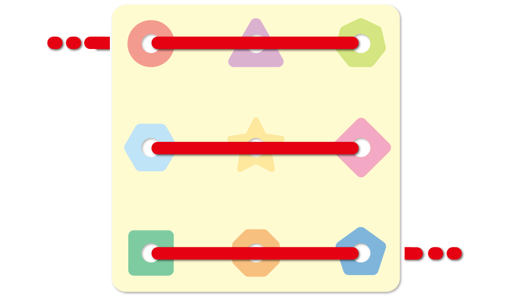 小学校入試で出題される「紐結び」「紐にビーズを通す」「お手本と同じになるように紐を通す」などの課題対策ができます。「お手本を見ながら、同じものを作る」という、実際の考査に近い形式でトレーニングできます。類題にチャレンジし、自信をつけましょう。
