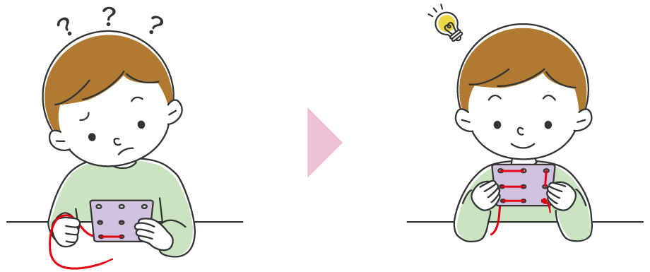 紐が絡まったり間違えたりしても、自分の手で戻してやり直す。その積み重ねが「失敗しても自分で解決できる」という自信を育てます。